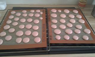 Vous remarquerez qu'après cuisson, le rose est beaucoup moins flashie. Les macarons ont eu chaud. C'est la première fois que je les cuit avec un exopat directement sur une grille et visiblement cela modifie les paramètres de cuisson. La prochaine fois je diminuerai la température de quelques degrés.