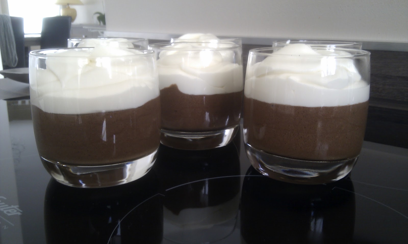 Il s'agit simplement d'une mousse au chocolat noir, surmontée d'une mousse au chocolat blanc. Pour la déco, quelques copeaux de chocolat noirs viendront égayer le tout.