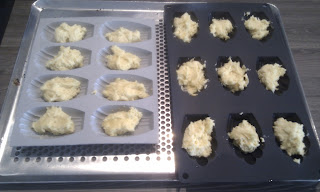 | 1ère fournée, les moules sont remplis à moitié à l'aide d'une cuiller. |