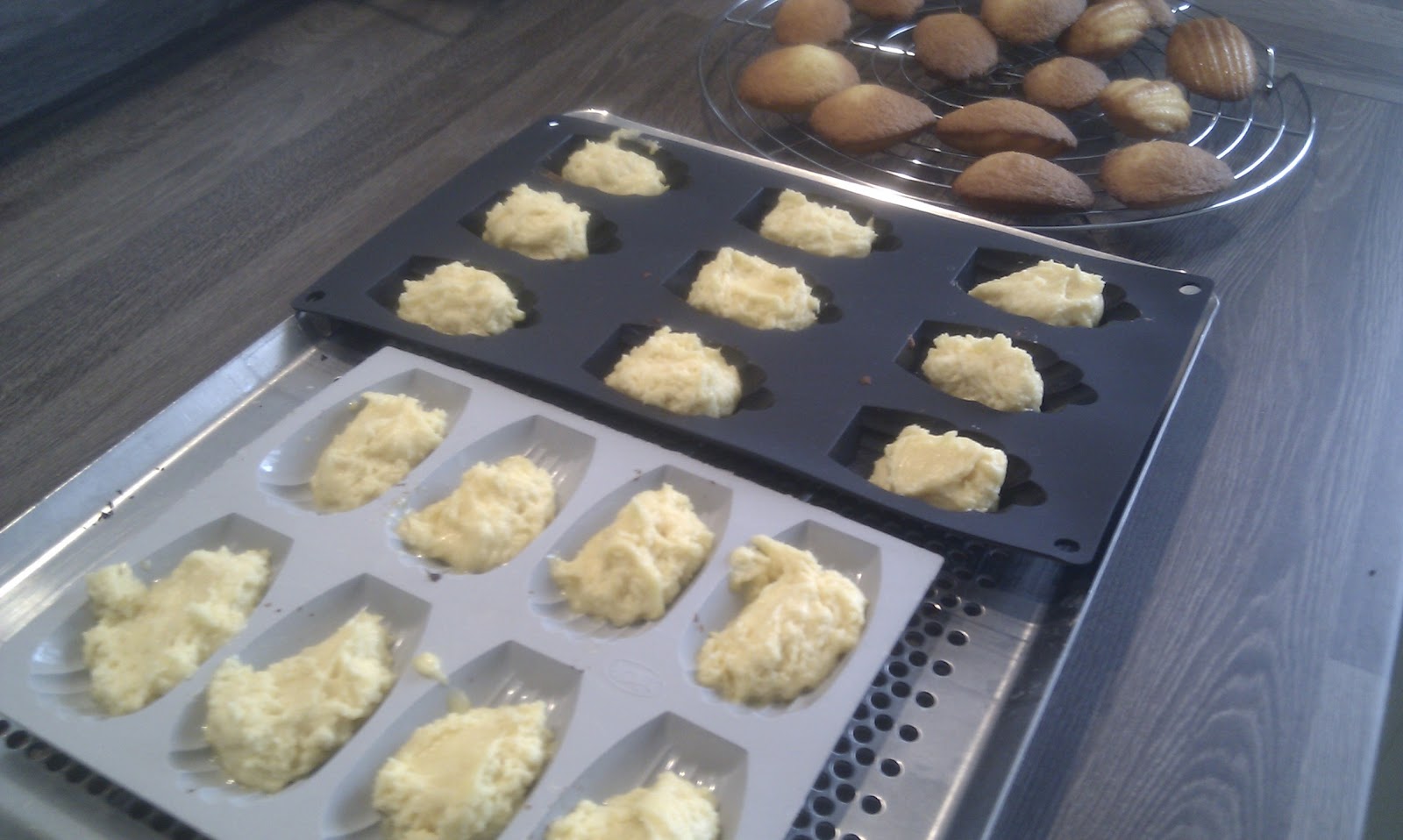 | 1ère fournée, les moules sont remplis à moitié à l'aide d'une cuiller. |